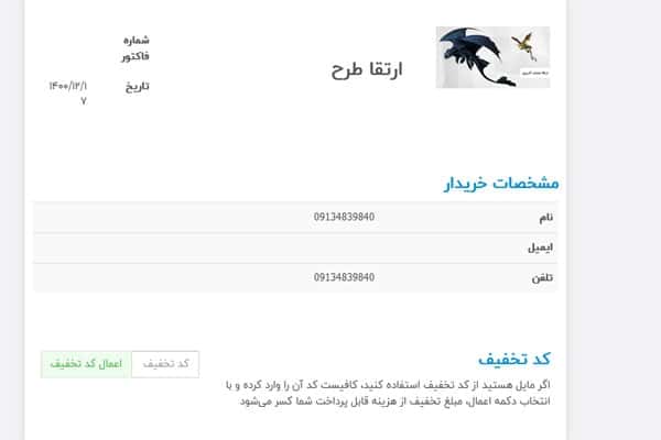 در این قسمت میتوانید پیشفاکتور را مشاهده کنید و اگر کد تخفیف دارید میتوانید آن را اعمال کنید و بعد پرداخت را انجام دهید. بعد از پرداخت حسابکاربری شما به طور خودکار، ارتقا پیدا خواهد کرد.