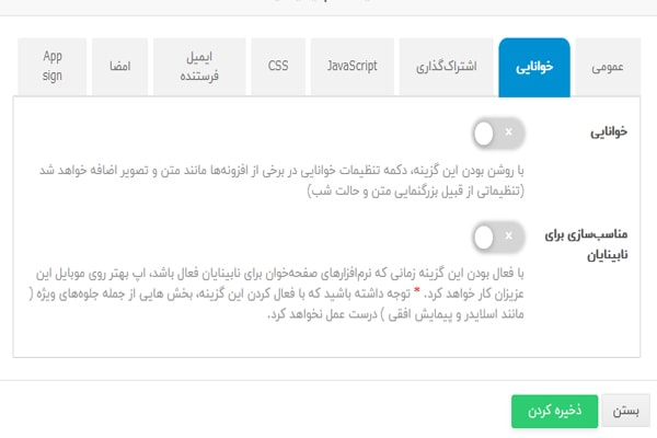 ۱. اگر خوانایی در تنظیمات اپلیکیشن را فعال کنید تنظیماتی به افزونههای (صفحات) متنوتصویر و لیست اپلیکیشنتان اضافه میشود که برای کمبینایان مورد استفاده قرار میگیرد. دقت کنید که این تنظیمات بعد از دانلود و نصب اپلیکیشن موبایل نمایش داده میشود. مانند تصویر زیر: