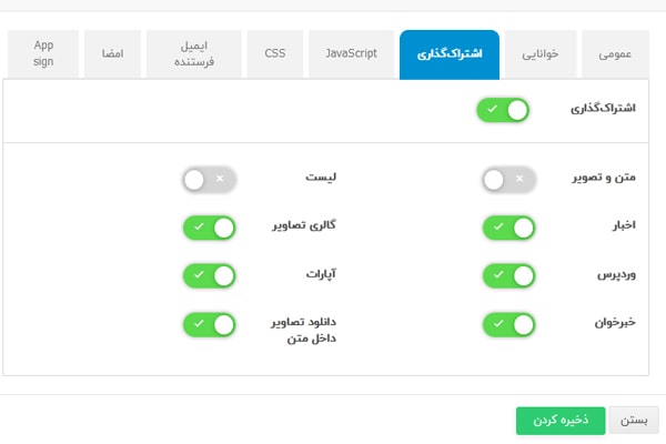اگر دکمهی «اشتراکگذاری» را روشن کنید، صفحاتی که قابلیت اشتراکگذاری دارند، نمایش داده میشود. برای هر کدام از بخشهایی که میخواهید قابلیت اشتراکگذاری داشته باشد دکمه آن را روشن کنید.