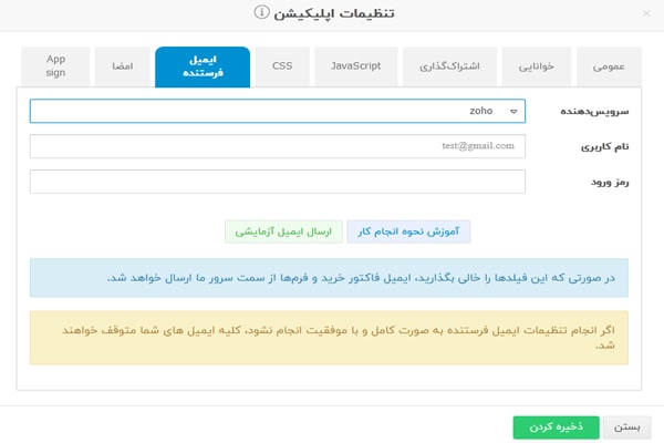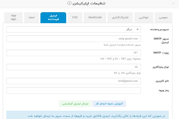 ۶. ایمیل فرستنده در تنظیمات اپلیکیشن: