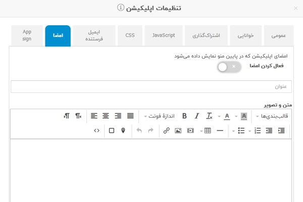 امضا اپلیکیشن در پایین منوی اپلیکیشن نمایش داده میشود و کاربردهای مختلفی میتواند داشته باشد.