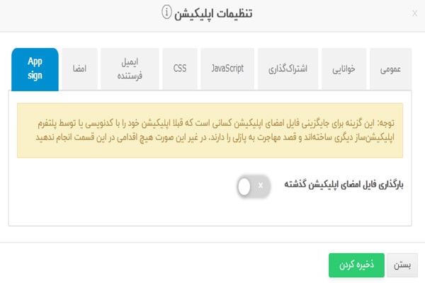 این گزینه برای جایگزینی فایل امضای اپلیکیشن کسانی است که قبلا اپلیکیشن خود را با کدنویسی یا توسط پلتفرم اپلیکیشنساز دیگری ساختهاند و قصد مهاجرت به سرورنت را دارند. در غیراینصورت هیچ اقدامی در این قسمت انجام ندهید.