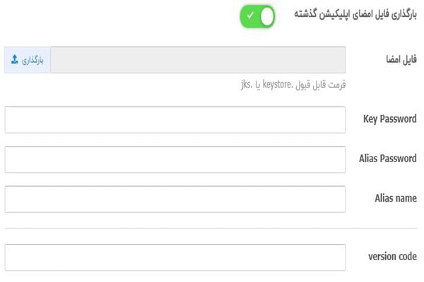 از قسمت فیلد اول میتوانید فایل امضای اپلیکیشنتان را آپلود کنید.