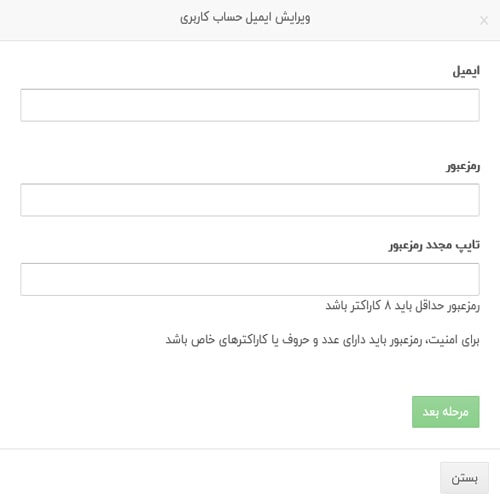 برای تایید ایمیل خود باید روی دکمهی “ثبت ایمیل و رمزعبور” کلیک کنید صفحهی زیر برای شما نمایش داده میشود و شما باید فیلدهای ایمیل، رمزعبور و تکرار رمزعبور را تکمیل کنید و دکمه مرحله بعد را بزنید تا ایمیل شما تایید شود.