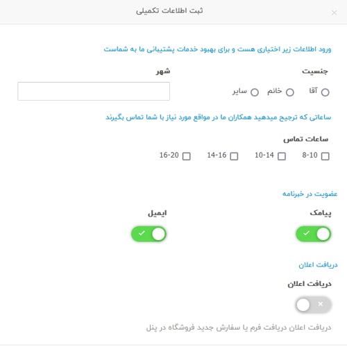 در این بخش میتوانید اطلاعات تکمیلی را وارد کنید. این اطلاعات اختیاری است و به ما کمک میکند تا خدمات پشتیبانی بهتری برای شما داشته باشیم. بهعنوان مثال زمانی که ما بدانیم چه ساعاتی برای تماس در روز برای شما مناسب است همکاران ما در همان ساعتها با شما تماس خواهند گرفت. در نهایت روی دکمهی “ذخیرهکردن” تغییرات کلیک کنید.